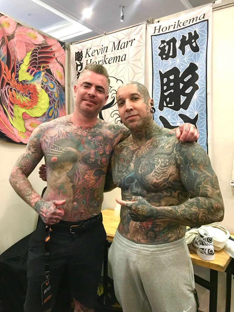 Kevin’s dedication and love for Japanese tattooing eventually led him to Japan in pursuit of learning more about the culture and the art. Within his numerous trips, Kevin completed his own bodysuit by world renown tattooers. In the process of getting tattooed he became friends with Master Horiyoshi III, who has been a great source of knowledge, work ethic and creative inspiration. Master Horiyoshi III eventually bestowed Kevin the Japanese name, “Horikema”. Receiving this title has been a huge honor, as it is given in recognition of his commitment to upholding the traditions of Japanese tattooing.